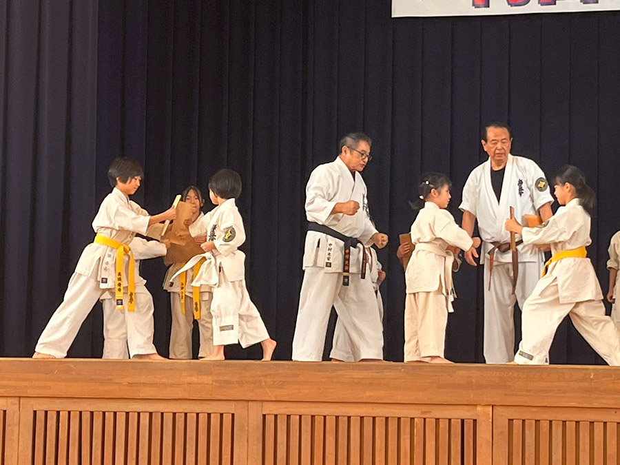 ステージ上、挨拶の後に抜粋の基本動作、型は帯別に太極そのI 、平安そのII 、撃砕大、撃砕小 。