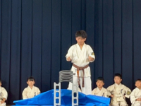 白帯による板割りを行い、最後は小学6年茶帯の先輩が 初の瓦割りに挑み、